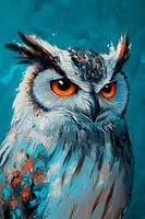 Een majestueuze oehoe troont op een heldere turquoise achtergrond, zijn doordringende blik als een geheim van de nacht. Met zijn fijne, torenhoge gevederde oren en feloranje ogen geeft hij het schilderij een fascinerende aanwezigheid, terwijl de levendige penseelstreken een gevoel van beweging en energie creëren. Een uitdrukking van…