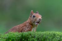 Een eekhoorntje kijkt vrolijk maar ook nieuwsgierig over een heuveltje heen. Groen bos achtergrond. foto is in Noord Brabant in Nederland gemaakt.