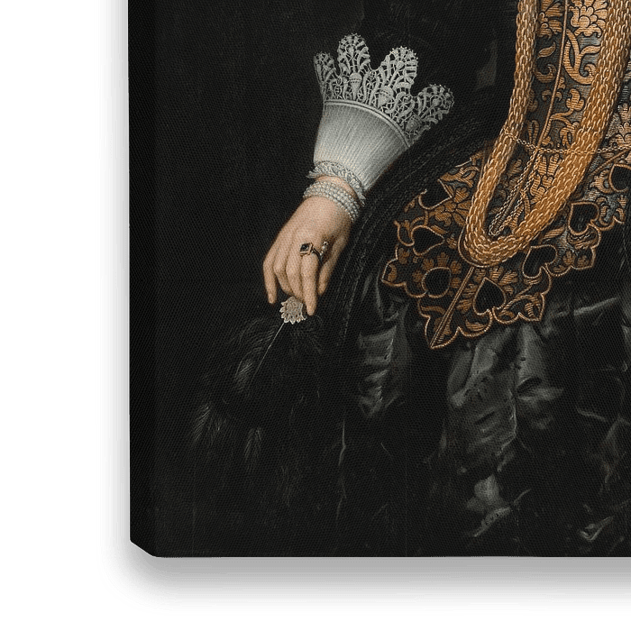 Deze onbekende jonge vrouw met een fijn, bleek gezicht, ziet er stijf uit in haar kleren. Het zwart, dat in Nederland, waar de meeste mensen in het begin van de 17e eeuw protestants waren, erg in de mode was, wordt gemoduleerd door de subtiele effecten van het licht, dat lijkt te schijnen op het satijn en de veren van de waaier. De soberheid van de achtergrond benadrukt nog eens het decoratieve detail, dat de aandacht trekt met zijn rijkdom: de juwelen en het brokaatlijfje, het kant op de mouwen, en de indrukwekkende kraag om haar hals. Deze kenmerken, zoals de keuze van de schilder - die de favoriete portretschilder van de aristocratie en de middenklasse was - wijzen op de hoge sociale status van het onderwerp.