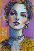 Portret van een vrouw in Italië | Vrouw met kleurrijke achtergrond - Op dit vrouwenportret schilderij zie je een vrouw met een opvallend sieraad en een kleurrijke achtergrond, met zachte lijnen en expressieve kleuren die haar gezicht benadrukken.
