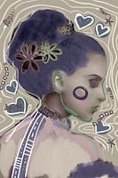 Dit kunstwerk is een speels digitaal schilderij in vergrijsde pastelkleuren. Een warme lichtgroen grijze zweem met teinten paars en aubergine, worden afgewisseld met helder wit. Het schilderij is speels, maar straalt door het kleurgebruik ook rust uit. Evenals de neergeslagen ogen van de geportretteerde vrouw deze rust met zich mee brengen. De hartjes en lijntjes rondom het portret zijn intuitief geplaatst en creeren een geheel eigentijds modern beeld.