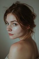 Dit elegante portret van een vrouw benadrukt haar natuurlijke schoonheid met zachte belichting en een eenvoudige achtergrond. De delicate belichting benadrukt haar zachte gelaatstrekken en diepe, expressieve ogen, terwijl het subtiele kleurenpalet een gevoel van rust en intimiteit uitstraalt. Ideaal voor kunstliefhebbers die houden van tijdloze en ingetogen elegantie in hun kunstwerk.