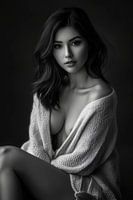 Een fascinerend portret dat fascineert door zijn subtiele elegantie en mysterieuze allure. De delicate monochrome kleur en gevoelige pose geven de foto een intieme sfeer. Ideaal voor de slaapkamer of elke andere kamer die een persoonlijk tintje en een elegante sfeer wil uitstralen.