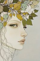 Zachte elegantie straalt van het gezicht van een mysterieuze figuur, omlijst door delicate bladeren in zachte groene tinten en warme aardse kleuren. Deze harmonieuze combinatie van natuur en menselijkheid geeft een rustgevende sfeer aan elke kamer. Ideaal voor de slaapkamer of het creatieve kantoor, het inspireert tot rust en innerlijke contemplatie.