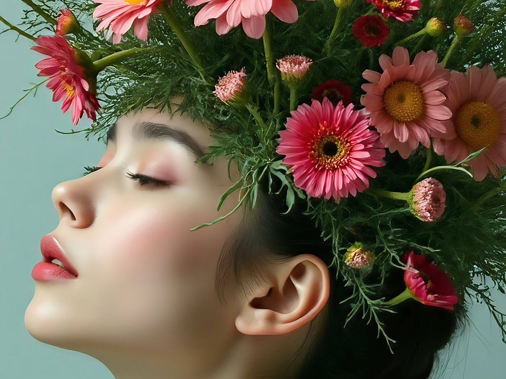 Een prachtig model met een bloemenkapsel wat een mooi surrealistisch beeld oplevert.