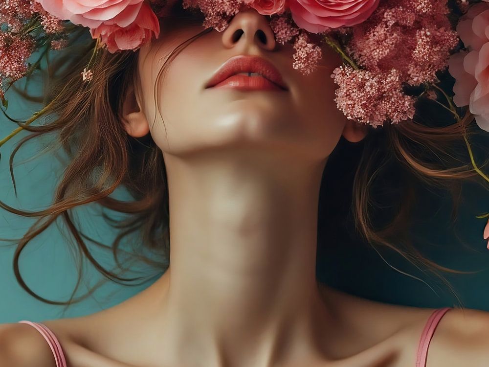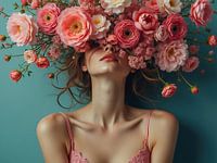 Een prachtig model met een bloemenkapsel wat een mooi surrealistisch beeld oplevert.