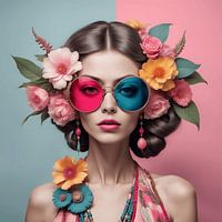 Portret van een vrouw met bloemen in het haar en een zonnebril op. Het heeft een retro look. Een kunstwerk voor aan de muur.