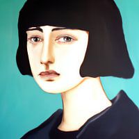 Portret van een donkerharige vrouw met haar haar in een boblijn tegen een lichtblauwe achtergrond. Dit portret is ontstaan door middels digitale technieken een foto, schilderij en illustratie samen te voegen. Een moderne Mona Lisa.