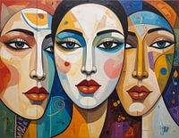 Een picturale en grafische compositie van drie vrouwelijke gezichten die zowel afzonderlijk als bijna versmolten lijken. Dezelfde gelaatstrekken, dezelfde dromerige uitdrukkingen, hetzelfde uiterlijk en toch zo complementair, zo dichtbij, alsof deze drie-eenheid een onderliggende eenheid onthult. Het enige detail dat hen zou kunnen onderscheiden is de kleur van hun ogen. Het centrale personage heeft een blauw oog en een bruin oog, en ook hier kunnen we zien dat dit de combinatie is van de ogen van de andere 2. Een vorm van synthese verschijnt, geïllustreerd door het centrale gezicht.