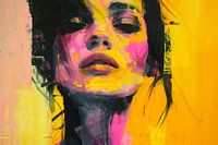 Dit indrukwekkende portret van een vrouw betovert met zijn levendige kleuren en expressieve penseelstreken. De sterke gele, roze en zwarte tinten creëren een sterk visueel contrast en geven het schilderij een krachtige uitstraling. De intense blik van de vrouw boeit de kijker en brengt een dynamische energie in elke kamer. Perfect voor moderne interieurs die op zoek zijn naar een opvallend en kleurrijk kunstwerk dat zowel persoonlijkheid als stijl uitstraalt.