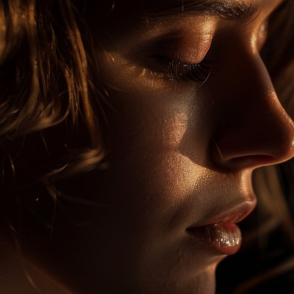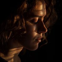 Dit betoverende portret toont de zachte schoonheid van het profiel van een vrouw, gehuld in warm licht. De subtiele schaduwen en het spel van licht en schaduw benadrukken de zachte gelaatstrekken en gesloten ogen, waardoor een gevoel van rust en innerlijke vrede ontstaat. Dit schilderij is ideaal voor liefhebbers van portretten en decoratieve kunst en voegt een delicate en rustgevende sfeer toe aan elke kamer.
