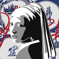 Een moderne bewerking van het 'Meisje met de Parel' van Johannes Vermeer op een achtergrond van Delfts blauwe tegels met tekeningen die iets vertellen over haar leven. De link tussen de tegels en het portret is dat zij beiden in Delft zijn gemaakt en daarnaast toevallig ook nog eens in precies dezelfde periode. Vandaar de delfts blauwe tegels als achtergrond. Het originele schilderij (een met acryl geschilderd portret op een geprinte achtergrond op canvas) is rechtstreeks beschikbaar bij kunstenaar in maat 1.00 x 1.00 m en 1.30 x 1.30 m. De overige afdrukvormen en alle mogelijke maten zijn via deze site te bestellen.
