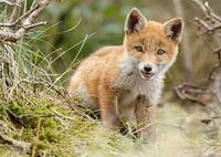 Een jonge nieuwsgierige jonge vossen welp kijk naar de camera
