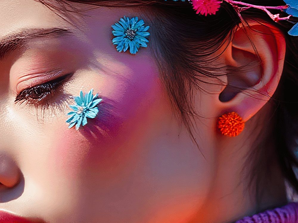 In het portret straalt de vrouw een aura van levendigheid uit, omringd door een explosie van kleuren. Haar gezicht, zacht verlicht, weerspiegelt een speelse vreugde, terwijl de bloemen in haar haar een natuurlijk element aan haar uitstraling toevoegen. De felle tinten van de bloemen contrasteren prachtig met de kleuren in de achtergrond, waardoor een betoverend effect ontstaat. Iedere bloem lijkt een verhaal te vertellen, een symbool van schoonheid en groei. De compositie is een harmonieus geheel, waarbij de kleuren samenkomen om de vitaliteit van het moment vast te leggen. Dit portret nodigt de kijker uit om te glimlachen en te dromen, een viering van de natuur en de kracht van vrouwelijke energie. Het is meer dan een afbeelding; het is een uitnodiging om de vreugde van het leven te omarmen.