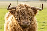 Een mooie close up foto van een schotse hooglander stier. De foto is gemaakt met telelens, waardoor ik het beeld heel dichtbij kan krijgen. De foto is mooi van voren genomen. De ogen van de stier zijn verstopt onder zijn manen. De lange haren beschermen hem tegen de regen en kou.