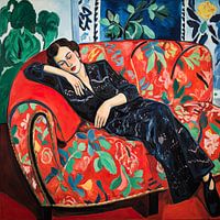 Dit kunstwerk toont een eigentijdse interpretatie van een slapende vrouw in een rode stoel.