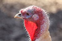 Portret van een tamme kalkoen (Meleagris gallopavo domesticus) in profiel. Kopfoto van een vrouwtjesvogel met levendige rode caruncles, halskwab en keel.