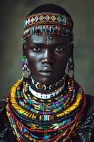 Dit kleurrijke portret toont een trotse Afrikaanse man in traditionele kleding en prachtige, handgemaakte kralenjuwelen. De kunstig ontworpen kralenpatronen en de felle kleuren van de kleding getuigen van culturele identiteit en vakmanschap. De details van de kettingen, oorbellen en hoofdtooien zijn indrukwekkend en stralen een majestueuze uitstraling uit. Deze foto is ideaal voor liefhebbers van Afrikaanse kunst en cultuur en geeft elke kamer een inspirerend en exotisch tintje.