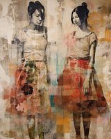 Moderne collage: portret van twee jonge, Aziatische vrouwen. Dit is een digitaal vervaardigde collage waarbij tekentechnieken, schildertechnieken en collagetechnieken gebruikt zijn. Het heeft zowel een moderne als vintage uitstraling, erg mooi aan je muur!