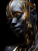Dit gezicht straalt mysterie uit met zijn diepe tinten van zwart en donkerblauw. Subtiele, verfijnde gouden verfstrepen accentueren strategisch de contouren en voegen een vleugje luxe toe. Het samenspel van deze kleuren creëert een intrigerend kunstwerk dat zowel kracht als verfijning uitstraalt, waarbij het goud een subtiele maar opvallende glans toevoegt aan het geheel.