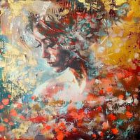 Levendige compositie die de vorm aanneemt van een portret, gemengd met abstracte elementen. Centraal staat het profiel van een figuur, waarschijnlijk een vrouw, omgeven door een caleidoscoop van kleuren en vormen die de indruk wekken van een dynamische, bijna dromerige achtergrond. De textuur en het kleurgebruik in dit schilderij zijn rijk en gelaagd, met roodtinten die eruit springen tegen een achtergrond van zachte blauw-, beige- en goudkleurige tinten.