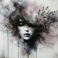 Dit intrigerende zwart-witte abstracte schilderij vangt de elegantie van een vrouw met bloemen/planten in haar haar in de kleur Mauve. De krachtige contrasten creëren een tijdloze esthetiek, waarbij de bloemen symbool staan voor groei en vernieuwing. De organische verstrengeling symboliseert de harmonie tussen mens en natuur, terwijl de vrouwelijke figuur zowel kracht als kwetsbaarheid uitstraalt. Met fijne details en texturen voegt het een tastbare dimensie toe, en de abstractie nodigt uit tot persoonlijke interpretatie. Dit werk, geschikt voor diverse interieurs, is een inspirerende en tijdloze toevoeging aan elke collectie.