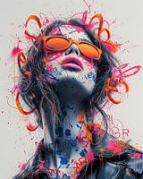 Dit kunstwerk vangt een vrouwelijk portret in een explosie van stedelijke expressie. De vrouw draagt feloranje zonnebrillen en haar gezicht en haar zijn versierd met dynamische spatten van roze, oranje, en blauwe verf. Deze spatten zijn doorspekt met schrijfsels die doen denken aan straatgraffiti. Haar pose is ontspannen maar haar uitdrukking is doordringend, alsof ze dwars door de chaos heen kijkt. Het is een digitale fusie van fotografie en verfspetters, wat resulteert in een stijl die zowel elementen van popart als moderne digitale kunst bevat, met een nadruk op jeugdige energie en stedelijk leven.