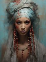 Portret van een vrouw met hoofddoek in de kleurstelling aquablauw en rood marron. Achtergrond en vrouw vervagen in elkaar. Prachtige ketting en details. Verfijnd en grof. Passend bij diverse stijlen en trends.