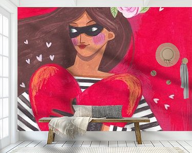 Een vrolijke moderne abstracte vrouw gekleed als dief, met een gestreept t-shirt, zwarte handschoenen en een Zorro masker op. In haar armen draagt ze haar buit, een gestolen rode hart. Ze is een hartendief met roze rozen in haar bruine haren tegen een rode achtergrond. Leuk voor de liefde of Valentijnsdag.