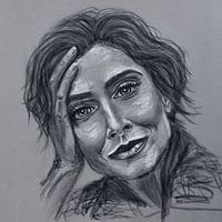 Losse pasteltekening van een mooie vrouw leunend op haar hand, verzonken in herinneringen. Uitgevoerd in zwart wit op een grijze achtergrond. Prachtig kunstwerk voor aan uw muur, passend bij diverse interieurs en meerdere trends.