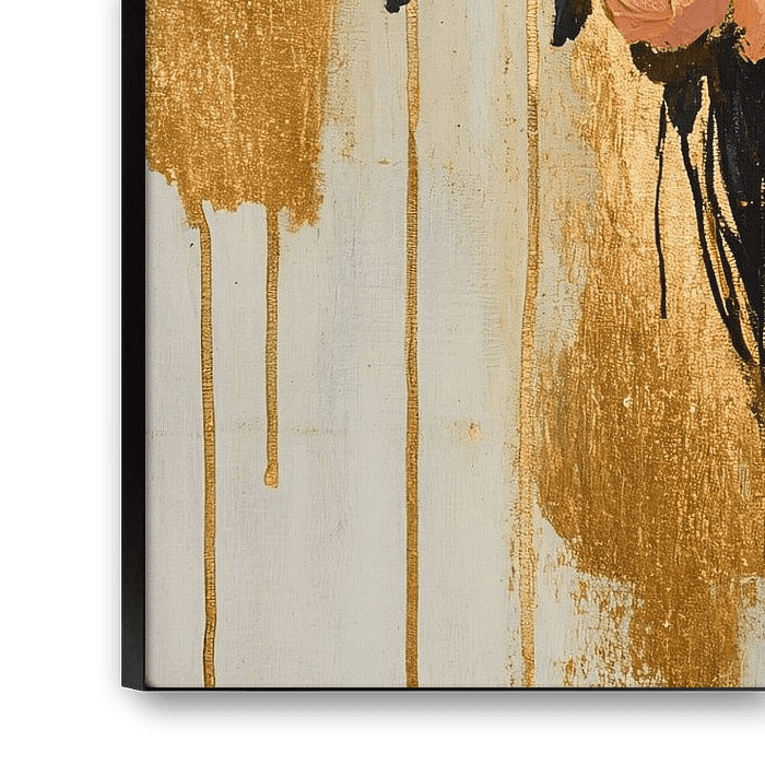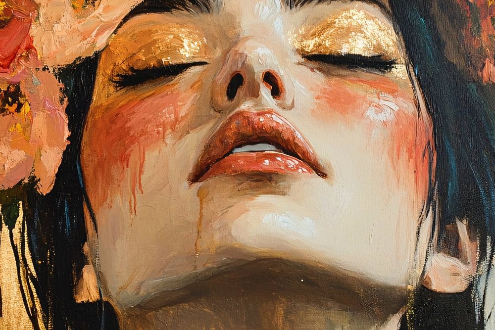 Een krachtig portret van een vrouw met gesloten ogen, omringd door een bloemenkrans tegen een achtergrond van rijke gouden accenten. De combinatie van warme kleuren en levendige details maakt dit kunstwerk een prachtige aanvulling op elke moderne ruimte. De delicate balans tussen vrouwelijke schoonheid en natuurlijke elementen straalt elegantie en verfijning uit, perfect voor het creëren van een warme, artistieke sfeer.