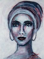 Schilderij van een abstract intuïtief portret van een mooie vrouw met hoofddoek. De vrouw is spontaan ontstaan vanuit gedachten, zonder voorbeeld of foto. Kleurstelling is wit, zwart, rood, blauw, grijs. Fantastische eyecatcher in uw interieur, tegelijkertijd ingetogen. Indringende sprekende ogen. sweet embrace.