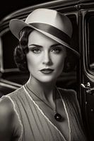 Een digitale beeldbewerking van een portret van een vrouw naast een auto.