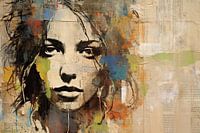 Portret - abstract schilderij / mixed media kunst geschilderd. Mooi contrast tussen het verfijnde portret en rauwe collage/schildertechniek.