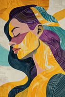 Portret - Dit portret valt op door de geometrische vormen en een dynamisch lijnenspel, gecombineerd met een warm kleurenpalet van okergeel en aubergine tegen een getextureerde achtergrond. De abstracte weergave van een vrouwengezicht, verstrengeld met organische vormen en grafische elementen, vormt een eigentijds staaltje kunst.