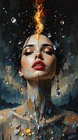 Haar silhouet zweeft door een landschap van vloeibaar glas, gesmolten zilver en goud, waar de hemel zichzelf weerspiegelt in druppels water en vuur ademt in de schaduwen. Shards of glass zweven als gedachten, breekbaar en scherp, terwijl transparante vormen zich vermengen met glinsterend metaal – een dans tussen zichtbaar en onzichtbaar.