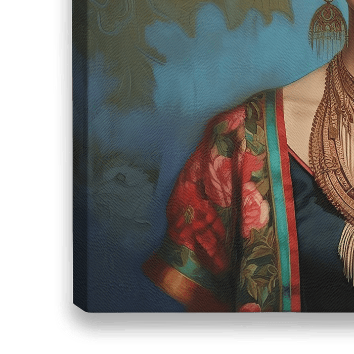 Dit krachtige portret van Frida straalt haar ongetemde geest en culturele trots uit. Haar kenmerkende wenkbrauwen en traditionele Mexicaanse kleding worden meesterlijk weergegeven, waardoor dit kunstwerk een dynamische weerspiegeling is van haar legendarische persoonlijkheid.