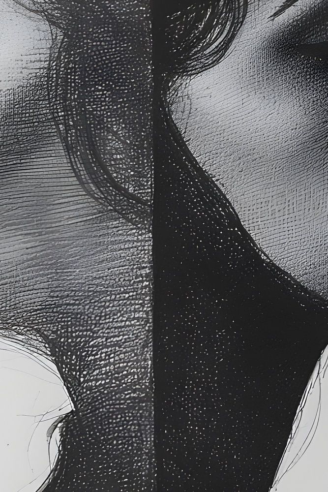 Een opvallend, handgetekend potloodportret met twee vrouwelijke profielen die van elkaar wegkijken en in het midden met elkaar verbonden zijn. Het werk verkent dualiteit, licht en schaduw met ingewikkelde, realistische arceringen.
