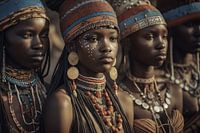 Portretten uit Afrika. Dit werk is onderdeel van de serie "Tribes", zie het album in mijn shop voor meer portretten. Je ziet een groep vrouwen in traditionele kleding en met authentieke sieraden. Een prachtig werk voor aan je muur!