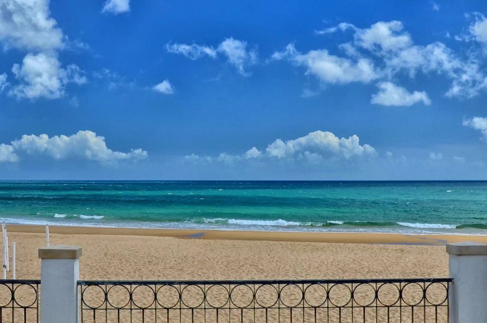 Praia da Luz strandpromenade, bankje en palmboom, uitzicht op zee. Algarve, Portugal.
