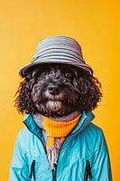 Met zijn krullende zwarte vacht en grote, expressieve ogen straalt deze Portugese Waterhond charme en persoonlijkheid uit. Gekleed in een kleurrijke trui en een gestreepte pet ziet hij er bijna uit als een stijlvolle modetrendetter die klaar is om de wereld te veroveren. De gele achtergrond benadrukt zijn vrolijke uitstraling nog eens extra.