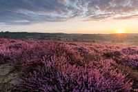 De zon steekt net zijn kop uit boven de horizon en dat geeft een mooi licht over het paarse heidelandschap