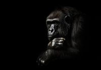 Pikante houding, handsteunen zijn hoofd. Aap anthropoïde gorilla vrouwtje. Een symbool van broedende rationaliteit en zware gedachten. geïsoleerde zwarte achtergrond.