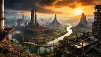 Post-apocalyptisch landschap met een verwoeste stad na een kernoorlog.