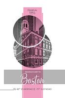 Klassiek stadsgezicht vanuit Boston in een modern design. Coördinaten en andere informatie gaan samen met Faneuil Hall om een minimalistische totaalindruk te creëren.