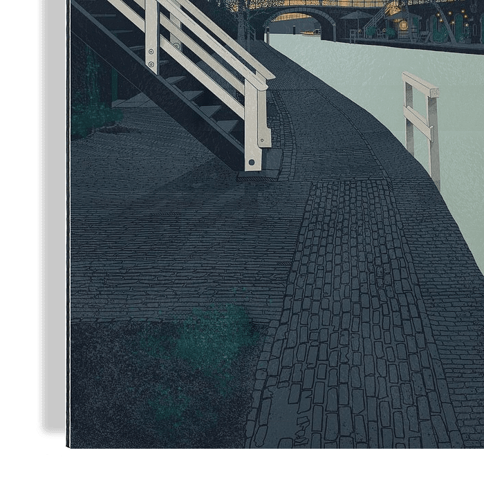 Deze illustratie toont de Zandbrug over de Oudegracht in Utrecht. Deze brug is bovendien vlak bij mijn huis dus ik heb een speciale band met deze buurt. Aangezien het herfst is en de dagen korter worden, loop ik tijdens "golden hour" van mijn werkplek naar huis aan het einde van mijn werkdag. De schemering valt in en de ondergaande zon…