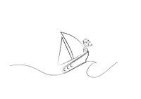 Poster met een zeilboot en zeiler. Op de golven onderweg naar de volgende haven. Een minimalistische illustratie uitgevoerd met alleen lijnen in het zwart.