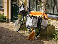 Oranje kat bij de fiets met oranje Post NL kleuren in in de Friese stad Leeuwarden...