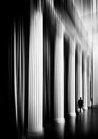 Een vrouw in de kerk van St. Nikolai in Potsdam. Ze loopt langs de zuilen. De gordijnen achter de zuilen geven het moment een bijzondere sfeer. Fine art straatfotografie in zwart-wit.