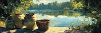 Potten Waterkant - Dit is een landschap schilderij met drie potten en een mand, geplaatst bij een rustige waterkant omringd door weelderig groen, stralend in het heldere daglicht, wat een serene sfeer oproept.
